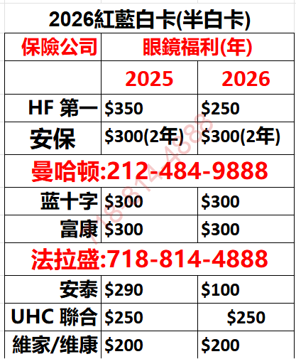 2026年紅藍白卡計劃 – 最高的眼科福利 了解2026年「全白卡」與「半白卡」福利差異,保障你的權益! 許多其他福利包括:OTC卡、牙科、聽覺、健身、為糖尿病人節省費用、 B 部分返還、交通接送,免費致電醫生問診的服務。 「點看」紐約紅藍卡福利 「點看」紐約紅藍卡 社安局福利 表格,指引和相關資訊 (2022)