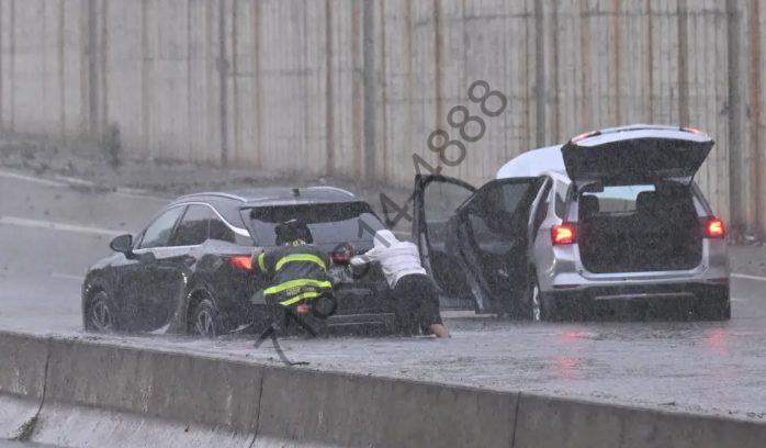 在曼哈頓東側的羅斯福大道(FDR Drive)上,交通陷入停滯,一些司機選擇放棄他們被淹的汽車。
