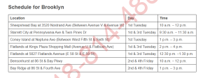 Location Day Time Brooklyn Sheepshead Bay at 3520 Nostrand Ave (Between Avenue V & Avenue W) 1st Tuesday 10 a.m. – 12 p.m. Brooklyn Starrett City at Pennsylvania Ave & Twin Pines Dr 1st & 3rd Tuesday 9:30 a.m. – 11:30 a.m. Brooklyn Coney Island at Neptune Ave (Between West Fifth St & Sixth St) 1st Tuesday 1 p.m. – 3 p.m. Brooklyn Flatlands at Kings Plaza Shopping Mall (Avenue U & Flatbush Ave) 1st & 3rd Tuesday 2 p.m. – 4 p.m. Brooklyn Flatlands at 5827 Flatlands Avenue (E 58 St & E 59 St) 1st & 3rd Tuesday 12:30 p.m. –1:30 p.m. Brooklyn Bensonhurst at 86 St & Bay Pkwy 2nd & 4th Friday 10 a.m. – 12 p.m. Brooklyn Bay Ridge at 86 St & Fourth Ave 2nd & 4th Friday 1 p.m. – 3 p.m. The Bronx Riverdale at 235th Street and Johnson Avenue 1st Wednesday 9 a.m. – 11 a.m. The Bronx Woodlawn Heights at Woodlawn Heights Library 1st Wednesday 12 p.m. – 2 p.m. The Bronx Bartow Mall on Co-op City Blvd (Near GVS Eye Care Center) 1st & 3rd Thursday 10:30 a.m. – 3 p.m. The Bronx Metropolitan Avenue & Yankee Mall (in front of Macy’s) 2nd Wednesday 10 a.m. – 2 p.m. The Bronx Knolls Crescent Mall (11-21 Knolls Crescent) 2nd & 4th Friday 10 a.m. – 12 p.m. The Bronx Fordham Plaza (3 Av between 188 and 189 Sts at E Fordham Rd) 2nd & 4th Friday 8 a.m. – 2 p.m. The Bronx East Bronx at 3602 E. Tremont Ave (Between Scott Pl & Sullivan Pl) 2nd Friday 1 p.m. – 3 p.m. The Bronx Riverdale at Skyview Shopping Center (Riverdale Ave between 256 St & 259 St) 3rd Wednesday 10:30 a.m. – 12:30 p.m. The Bronx Kingsbridge at 231 St & Broadway 3rd Wednesday 1:30 p.m. – 3:30 p.m. Manhattan East Side at 57 St & First Ave 1st & 3rd Tuesday 1 p.m. – 3 p.m. Manhattan Lenox Hill at 68 St & First Ave (Near Memorial Sloan Kettering) 1st & 3rd Tuesday 10 a.m. – 12 p.m. Manhattan Lower East Side at Catherine St & Madison St 1st Wednesday 10 a.m. – 12 p.m. Manhattan Upper East Side at 79 St & York Ave (On York between 78 St & 79 St) 1st & 3rd Wednesday 10 a.m. – 12 p.m. Manhattan Lower East Side at Grand St & Lewis St 1st Wednesday 1 p.m. – 3 p.m. Manhattan Lenox Hill at 72 St & York Ave (In front of Manning Nursing Home) 1st & 3rd Wednesday 1 p.m. – 3 p.m. Manhattan Turtle Bay at 47 St & Second Ave 1st Thursday 1 p.m. – 3 p.m. Manhattan Carnegie Hill at 92nd Street Y 1st Thursday 10 a.m. – 12 p.m. Manhattan Kips Bay at 28 St & Second Ave 1st Thursday 10 a.m. – 12 p.m. Manhattan East Harlem at 106 St & Second Ave 1st Thursday 1 p.m. – 3 p.m. Manhattan Upper West Side at 96 St & Broadway 1st & 3rd Friday 10 a.m. – 12 p.m. Manhattan Upper West Side at 86 St & Broadway 1st & 3rd Friday 1 p.m. – 3 p.m. Queens Forest Hills at 71 Ave-Continental Ave & Queens Blvd 1st Friday 10 a.m. – 12 p.m. Queens Flushing at Main St & Roosevelt Ave (Facing Roosevelt Ave) 1st & 3rd Friday 8 a.m. – 3 p.m. Queens Rego Park at Mall (Marshalls) (Queens Blvd & 63 Rd) 1st Friday 1 p.m. – 3 p.m. Staten Island New Springville at Yukon Ave (Near Yukon Bus Depot) 2nd & 4th Tuesday 10 a.m. – 12 p.m. Staten Island Castleton Corners at Victory Blvd (Off Manor Rd) 2nd & 4th Tuesday 1 p.m. – 3 p.m.